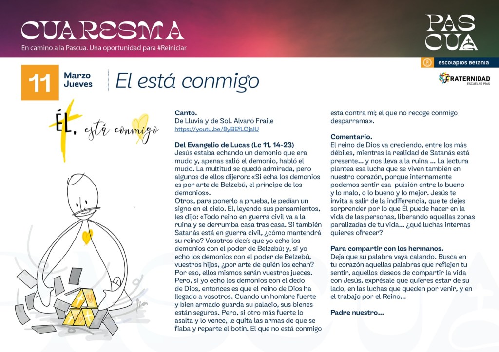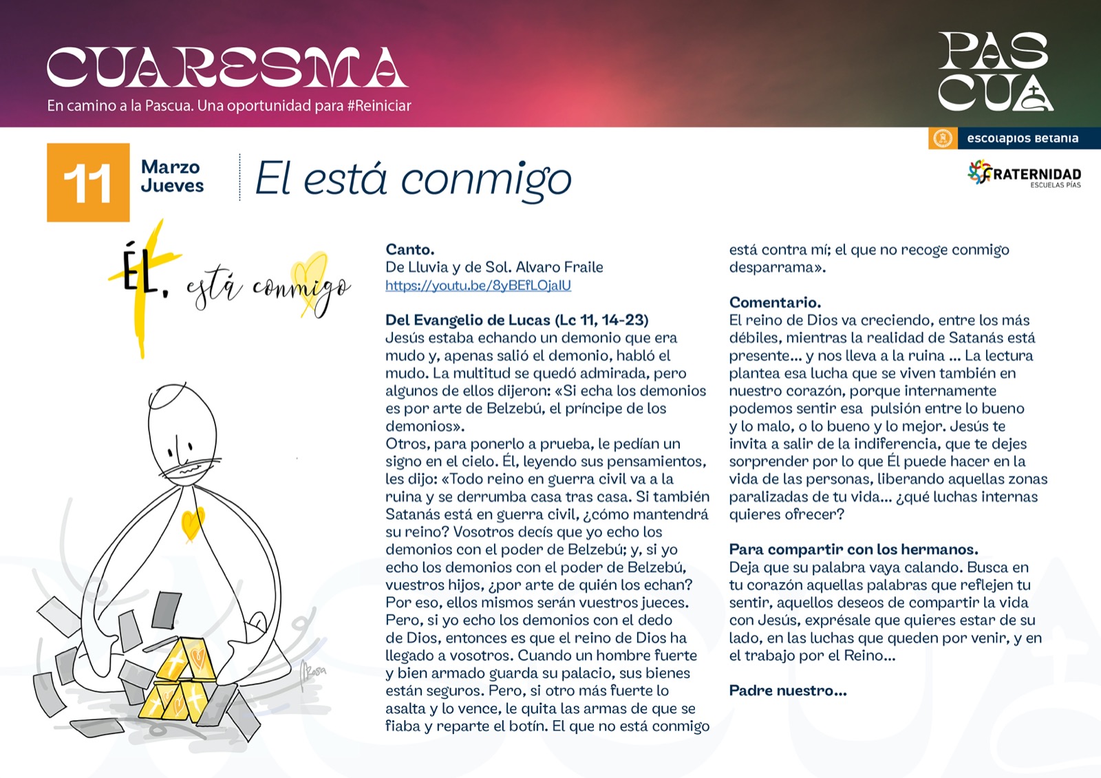 Iremos publicando las peticiones y acciones de gracias que recibamos al final de «la oración de los lunes». Y algunas, las volveremos a compartir en la eucaristía de la Comunidad Cristiana Escolapia (domingo a las 12:30 en la Iglesia Nuestra Señora de Aluche)