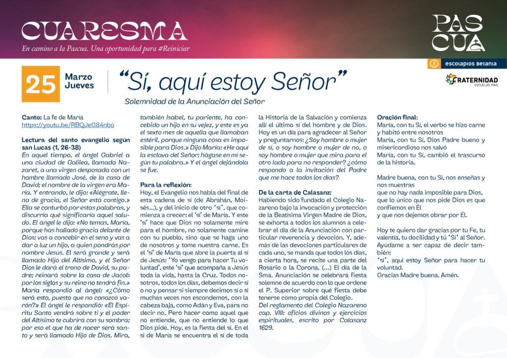 Iremos publicando las peticiones y acciones de gracias que recibamos al final de «la oración de los lunes». Y algunas, las volveremos a compartir en la eucaristía de la Comunidad Cristiana Escolapia (domingo a las 12:30 en la Iglesia Nuestra Señora de Aluche)