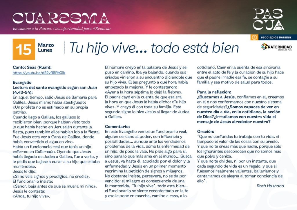 Iremos publicando las peticiones y acciones de gracias que recibamos al final de «la oración de los lunes». Y algunas, las volveremos a compartir en la eucaristía de la Comunidad Cristiana Escolapia (domingo a las 12:30 en la Iglesia Nuestra Señora de Aluche)
