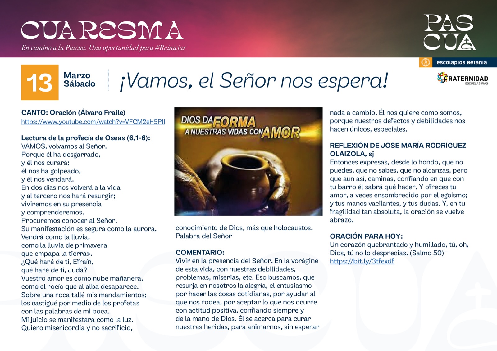 Iremos publicando las peticiones y acciones de gracias que recibamos al final de «la oración de los lunes». Y algunas, las volveremos a compartir en la eucaristía de la Comunidad Cristiana Escolapia (domingo a las 12:30 en la Iglesia Nuestra Señora de Aluche)