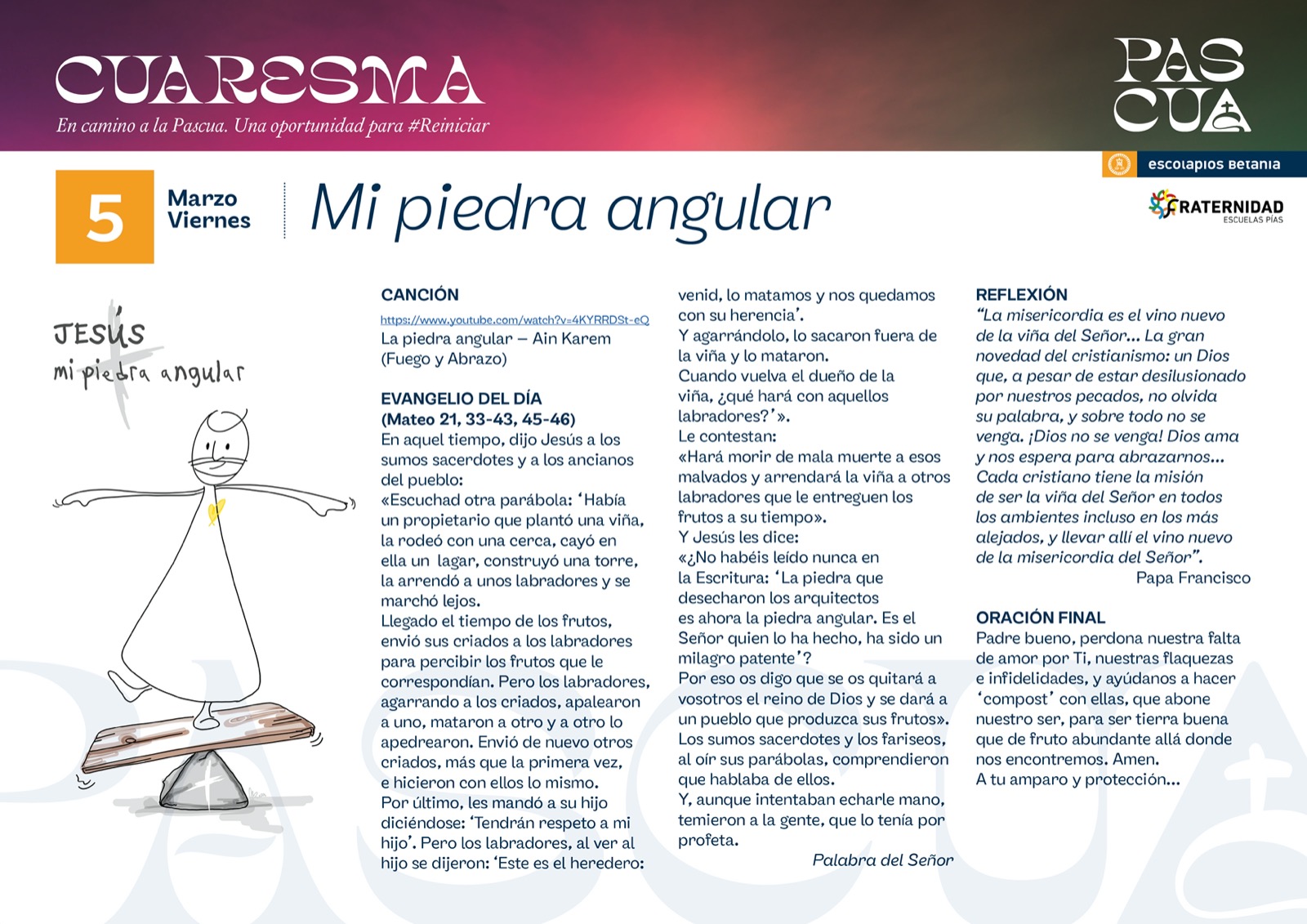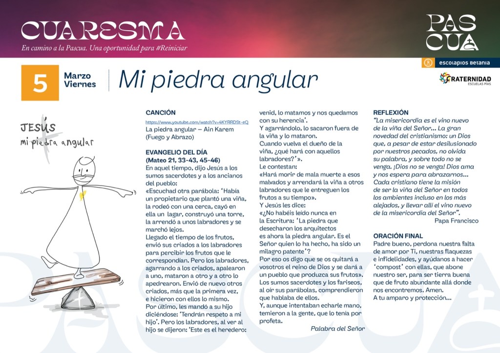 Iremos publicando las peticiones y acciones de gracias que recibamos al final de «la oración de los lunes». Y algunas, las volveremos a compartir en la eucaristía de la Comunidad Cristiana Escolapia (domingo a las 12:30 en la Iglesia Nuestra Señora de Aluche)